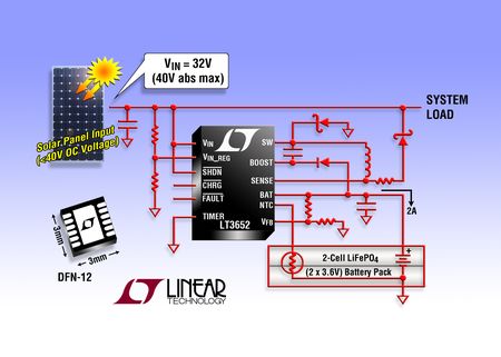 凌力爾特公司 (Linear Technology Corporation) 推出一款創新、面向太陽能電源的單片式降壓型電池充電器 IC LT3652,該器件適合新式電池化學組成。LT3652 運用了一種創新的輸入電壓調節環路,該環路負責控制充電電流,旨在將輸入電壓保持在一個編程的電平上。當把 LT3652 連接至一塊太陽能電池板時,輸入調節環路將把電池板保持在峰值輸出功率。凌力爾特公司電源產品部副總裁兼總經理 Steve Pietkiewicz 表示:“LT3652 具有簡單但獨特的輸入電壓調節環路,其實際上提供的充電效率與更加復雜和昂貴的最大峰值功率跟蹤 (MPPT) 方法相比時毫不遜色。”