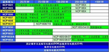 安森美半導體提供豐富PFC控制器選擇,如NCP1601/5/6/7/8、NCP1631、NCP1650/1/2/3/4等,涵蓋上述不同工作模式,優化用于不同功率的應用,見表1。如NCP1606/7/8采用CrM工作模式,適合于功率通常低于300 W的中等功率應用,如電子鎮流器、液晶電視、等離子電視、臺式計算機和交流適配器等。最新推出的NCP1654均工作在CCM模式,適用于功率大于200 W以上的場合。NCP1654的前身NCP1653推出幾年來已經獲得了極大的成功,廣泛應用于臺式計算機,開放式電源等領域。特別是在液晶電視和等離子電視中更是占據了絕大多數的市場份額。