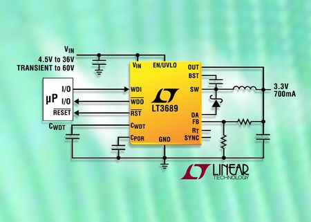照片說明:具上電復位和看門狗定時器的 36V (60V 瞬態電壓保護)、700mA 降壓型穩壓器