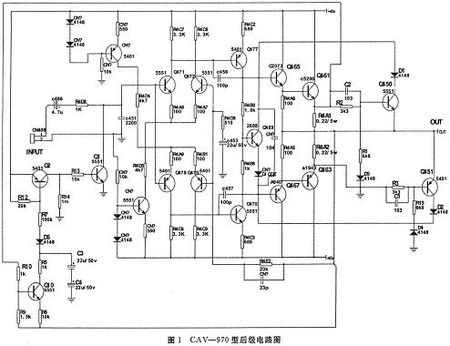 圖1是CAV-970型功放機電圖,這是一個全對稱。雙差分、雙恒流源OCI。功放電路,本文只對其保護電路作一些介紹。