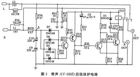 圖3是奇聲AV-388D后級功放的保護觸發、驅動電路。直流檢出電路由D4~D7組成的橋式整流電路,再由Q15、Q14加以放大,推動施密特觸發器工作。無論左右聲道出現正的或負的電壓都可能使Qi5、Q14導通驅動后級釋放繼電器,使功放和音箱得到保護。