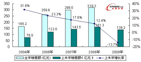 圖1 2005-2009年上半年中國電源管理芯片市場銷售額規模及增長率