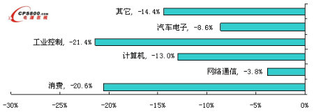 圖2 2009年上半年中電源管理芯片市場各應用領域增長率