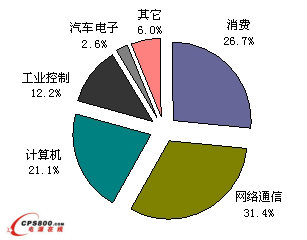 2009年上半年計算機類、消費類、網絡通信類三大領域仍然占中國電源管理芯片市場近80%的市場份額,其中網絡通信類市場最大,其市場份額都超過了30%。從發展速度來看,往年發展速度最快的汽車電子類的電源管理芯片市場也出現了8.6%的下滑,而網絡通信累電源管理芯片市場雖然也出現了一定降幅,但由于中國3G市場的帶動,其市場僅出現3.8%的降幅,是所有電源管理芯片應用領域中降幅最小的領域。而在行業整體下滑的背景下,工業控制類電源管理芯片市場則由于沒有明顯的市場推動因素而出現21.4%的大幅下降。消費電子類集成電路市場的下降幅度雖然也出現了超過20%的下降幅度,但是未來隨著中國家電下鄉的拉動,市場的降幅可能會逐漸縮小。其它領域和計算機領域的發展速度則基本與整體市場持平。整體來看,所有領域的電源管理芯片市場都在下滑,但是由于網絡通信領域的降幅較小而工業控制領域的降幅較大,因此2009年上半年,應用于網絡通信領域的電源管理芯片市場份額同比有所提升,而工業控制領域的份額則同比下滑。
