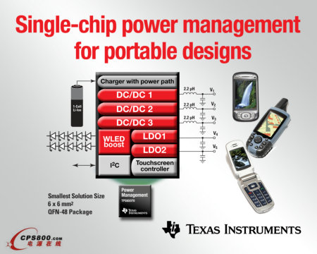 TPS65070 與 TPS65073 產(chǎn)品高度集成了 3 個高效率 2.25 MHz、1.5 A DC/DC 降壓轉(zhuǎn)換器(支持內(nèi)核處理器、存儲器以及 I/O 電壓)、兩個通用 200 mA LDO、白光 LED 背景照明(可支持達 5 英寸的 LED 顯示屏)、I2C 通信接口、10 位模數(shù)轉(zhuǎn)換器、觸摸屏接口以及集成 1.5 A 線性電池充電器,與分立設(shè)計相比,可將 DC/DC 實施方案的面積占用銳降 50%。