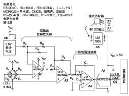 這是圖1所示的方框圖中模擬部分。放大器和參考電壓連接到ADC,ADC再連接到微控制器。為了建立一個二階低通濾波器(A3)需要兩個電阻器、兩個電容器和MCP6022運算放大器。另一個放大器組成了一個儀器放大器,其中使用了旁路電容器。