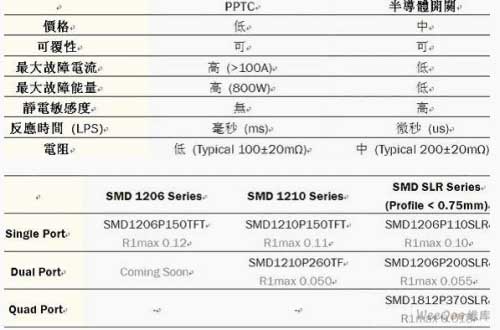 表:PPTC及半導(dǎo)體開(kāi)關(guān)在1A應(yīng)用下的比較。■