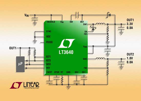 凌力爾特公司 (Linear Technology Corporation) 推出雙通道、電流模式降壓型開關穩壓器 LT3640,該器件具有上電復位和看門狗定時器。其 4V 至 35V 的輸入電壓范圍和可承受 55V 瞬態使該器件非常適用于汽車應用中常見的負載突降和冷車發動情況。LT3640 運用一種獨特的雙通道設計,有一個高輸入電壓 (4VIN 至 35VIN,55VIN 瞬態) 的非同步通道,該通道提供了 1.1A 輸出電流;器件還有一個更低輸入電壓 (2.5VIN 至 5.5VIN) 的同步通道,這個通道提供高達 0.9A 的連續輸出電流。盡管該器件允許每個通道有獨立的輸入,但是大多數應用將用高壓通道輸出為較低電壓的通道供電,從而提供雙輸出,同時優化效率和開關頻率。例如,用標稱的 12V 輸入和 2MHz 開關頻率,LT3640 可以通過其高壓通道在 600mA 時以 85% 的效率提供一個 3.3V 輸出,通過其較低電壓通道在 800mA 時以 87% 的副端轉換效率提供一個 1.8V 輸出。