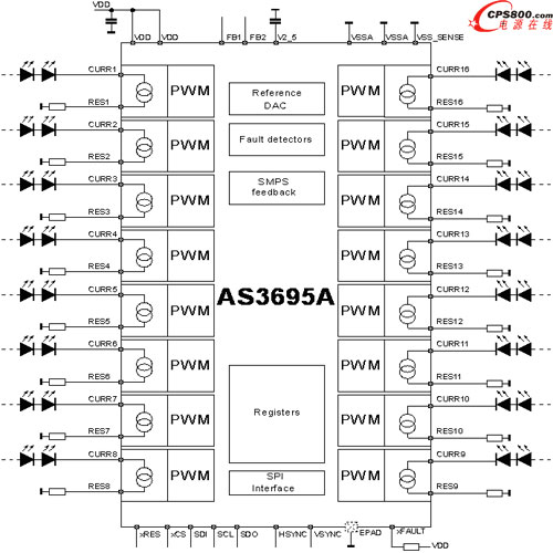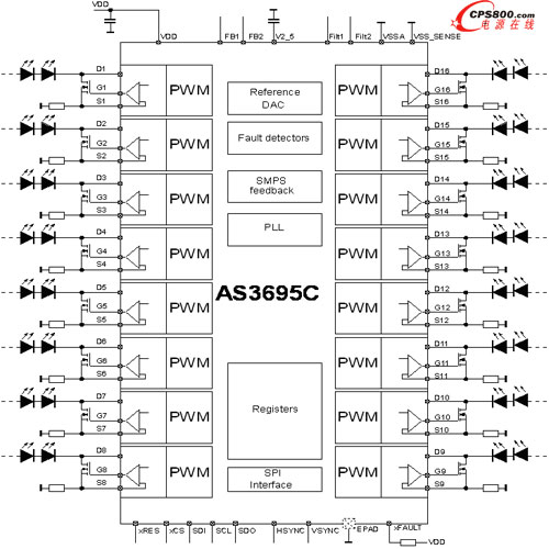 這兩款IC都在電源管理方面表現(xiàn)出色,且擁有最佳的精度。±0.5%出色的驅動器精度確保了精準的亮度和色彩搭配。±0.2%的通道對通道的電流匹配可產(chǎn)生高光照對比度,從而實現(xiàn)最佳的畫質和3D效果。此外,高精度的AS3695A和AS3695C 采用了新型電源反饋調節(jié)器,能夠很好地控制外部電源,實現(xiàn)最高的系統(tǒng)效率并降低LCD電視的LED背光功耗。