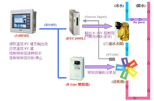 系統(tǒng)通過上位臺達(dá)HMI進(jìn)行控制系統(tǒng)的監(jiān)控,通過RS485協(xié)議連接臺達(dá)變頻器和溫控器;前者用于驅(qū)動送風(fēng)量,后者用于控制三通冰水閥;這樣通過送風(fēng)量和冰水閥的調(diào)節(jié)就可以實(shí)現(xiàn)對中央空調(diào)恒溫系統(tǒng)的有效控制。
