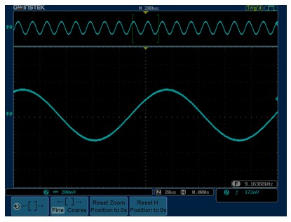 The GDS - 3000系列窗口放大功能提供在同一時間下能以雙顯示模式同時顯示主要波形和放大波型二部份。 在“窗口放大”模式中,工程師可使用光標任意決定對于主要的波形其需要放大的寬度和位置,放大窗口中會把光標已圈選的范圍進行擴展放大,藉以提供工程師詳細的波型細節。“窗口放大”模式當中其光標設定提供粗/微調功能,可以幫助工程師快速且精準的移動縮放窗口中任何預期的位置。