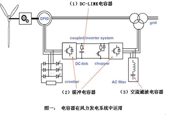 現在國家都在大力提倡使用風能、太陽能,這是清潔能源。所以現在越來越多公司在設計太陽能發電、風能發電電源管理系統的時候,選型時主要是高電壓、大容值的電容器有很大的產品需求。比如風能產品系統,有三處運用電容器到這個產品中,第一個可以選用薄膜電容器做高電壓吸收的應用;還有一個是DC-LINK,DC-DC轉換過程中,起濾波儲能的作用;還有并網的時候還有抗干擾的電容。見圖一所示。