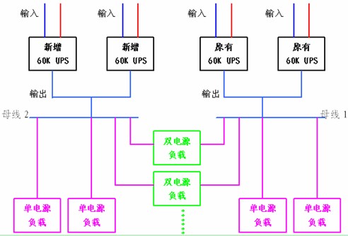 由于原系統為早期規劃建設,所有用電負載輸入端的電源均采用2臺60KVA UPS并聯輸出電源。要求新增加UPS系統與原有系統構成雙母線優化方案為原有的設備及新增的設備提供安全可靠的電源保護;