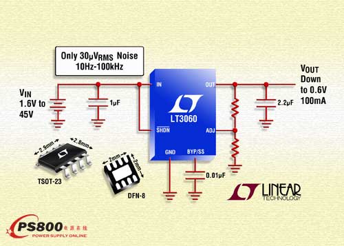 凌力爾特公司 (Linear Technology Corporation) 推出高壓、低噪聲、低壓差電壓線性穩壓器 LT3060。該 IC 在滿負載時提供高達 100mA 的連續輸出電流和 300mV 壓差電壓。LT3060 具有 1.6V 至 45V 的寬輸入電壓范圍,提供從 0.6V 到 44.5V 的可調輸出電壓。單個電容器提供可編程超低噪聲工作 (在 10Hz 至 100kHz 寬帶寬范圍的噪聲僅為 30uVRMS) 和基準軟啟動功能,可在接通時防止輸出電壓過沖。隨電壓、負載和溫度變化,LT3060 的輸出電壓容限是高度準確的 ±2%。該 IC 的寬輸入和輸出電壓范圍、快速瞬態響應、40uA (工作時) 和 <1uA (停機時) 的低靜態電流使其非常適合于需要最佳運行時間的便攜式電池供電系統、以及于汽車、工業和航空電子設備電源的應用。
