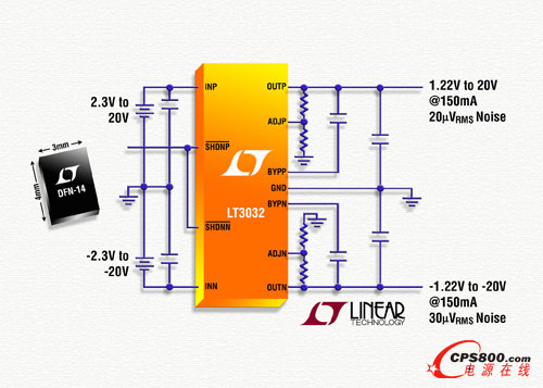 照片說明:±20VIN、±150mA 雙輸出正/負超低噪聲 LDO