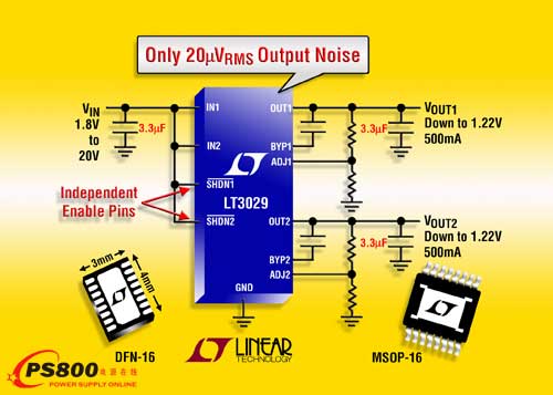凌力爾特公司 (Linear Technology Corporation) 推出雙路低噪聲、低壓差穩(wěn)壓器 LT3029,該器件具有面向每個(gè)通道的獨(dú)立輸入和獨(dú)立停機(jī)控制。在滿負(fù)載時(shí),LT3029 以僅為 300mV 的低壓差電壓提供每通道高達(dá) 500mA 的連續(xù)輸出電流。LT3029 具有 1.8V 至 20V 的寬輸入電壓范圍,提供低至 1.215V 和高達(dá) 19.5V 的輸出電壓。該器件在 10Hz 至 100kHz 的寬帶寬上具有僅為 20uVRMS 的超低噪聲,并提供跟蹤/排序功能。其全面的功能集以及每穩(wěn)壓器 55uA (工作時(shí)) 和 <1uA (停機(jī)時(shí)) 的低靜態(tài)電流使該器件非常適用于電池供電型的“保持運(yùn)作”系統(tǒng),這類(lèi)系統(tǒng)除了微處理器內(nèi)核邏輯電源、跟蹤/排序電源和通用電壓轉(zhuǎn)換,還需要最佳運(yùn)行時(shí)間。