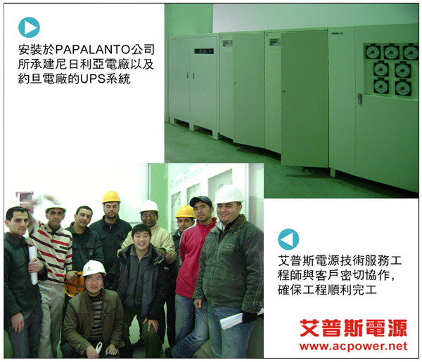 近期,PAPALANTO公司向艾普斯電源購買了兩套UPS,用于其承建的尼日利亞電廠及約旦電廠,每套設備包括兩臺UPS(50KVA)系統并機及 80KVA 旁路穩壓柜。兩套設備已于2010年初安裝完成,在順利通過性能測試后正式投入使用。