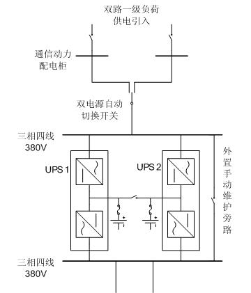 為進一步提高整個UPS供電系統的可靠性,建議UPS按照冗余方式進行配置,目前UPS供電方案主要“1+1”并聯冗余和雙總線方案為主。其中并聯冗余技術及系統結構簡單、性價比高、技術成熟等特點,被廣泛應用于各種規模的電力調度中心。一般情況下,UPS并機系統的可靠性,可以達到0.99999以上,遠高于一般的電網0.9的供電可靠性,滿足現有調度中心對供電可靠性的要求。