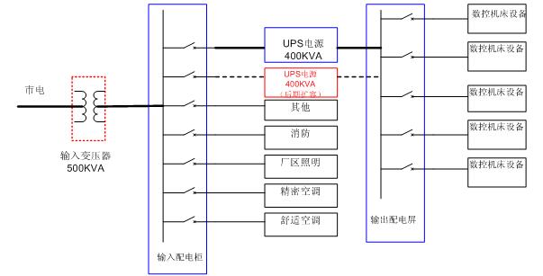 我們建議規劃為UPS集中供電的解決方案,采用1臺UPS的輸入交流可以選擇采用輸入配電柜供給UPS市電輸入,再經過UPS電源的單機系統給輸出配電柜供電,重要關鍵負載(穩壓器、數控機床設備)全部由UPS輸出配電柜配電供電,次要負載(廠區照明設備、空調設備、消防設備等)全部由輸入配電柜配電供電。