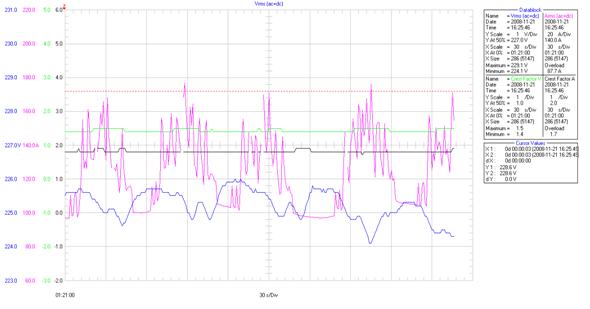 上圖粉紅色為一段時間的負載電流變化曲線,我們可以看到負載電流會從100A左右,突變到最大170A,負載電流變化率非常大,達到了70%,這對UPS逆變器耐受沖擊性能、和負載突變時的電壓變化量要求都非常高。