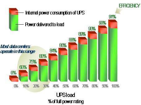 那么,建設綠色數據中心最大的挑戰是什么呢?IDC公司一項針對CIO的調查顯示,70%的被訪者認為那就是電源和制冷問題。為確保供電系統的高可靠性,采用具有冗錯技術的UPS供電系統,比如:并機冗余供電、雙總線冗余供電等方案,其UPS系統實際運行的負載情況都是在30%左右,目前數據中心面臨著低效率運行的問題。下列為傳統UPS在不同負載百分比情況下的效率示意圖。