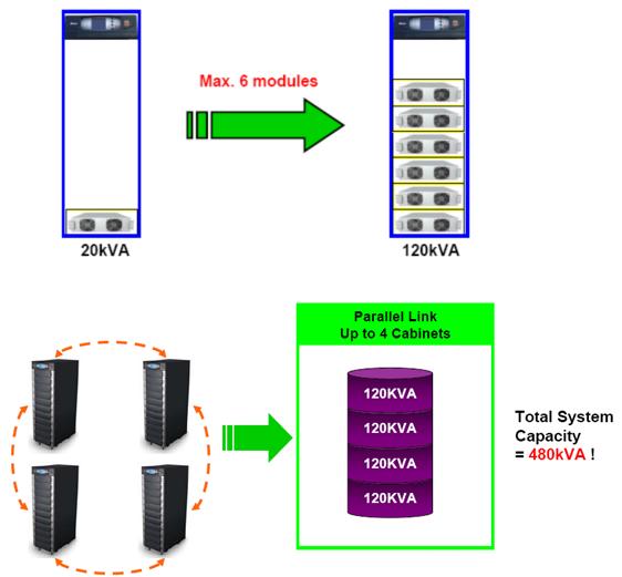 HIFT UPS因采用模塊化結構,可以在20kVA到480kVA的寬廣范圍內,以20kVA為單位來隨時隨需在線擴容,客戶不再需要僅是為未來的可能性而提前投入大筆費用。