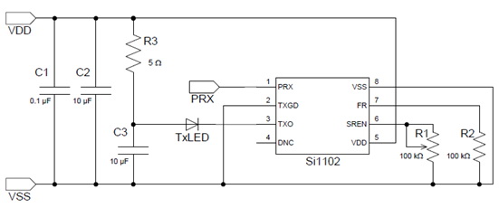 Si1102是一個可獨立工作的紅外接近傳感器,能驅動單個紅外LED。LED發射的紅外線經過接近物體反射到達內置的紅外線光電二極管被接收,然后經過信號的放大并進行信號處理,最后通過與一個設定的探測門限值比較輸出一個相應邏輯電平,如果測量的結果高于這個門限值則從PRX口輸出一個低電平。利用這種電平信號的輸出可以用來作為其他工作的驅動或者是做MCU的中斷輸入,進而實現近距探測功能。