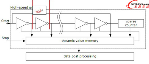 TDC是ACAM核心的超高精度的時間間隔測量產(chǎn)品,全數(shù)字化集成電路,采用標(biāo)準(zhǔn)CMOS工藝制造,對溫度和電壓的變化采用補(bǔ)償方式,以便能同時滿足高精度、高測量刷新率、低功耗和小體積等方面的要求。具體來講,TDC是以信號通過內(nèi)部門電路的傳播延遲來進(jìn)行高精度時間間隔測量的,如下圖1顯示了這種測量絕對間隔時間TDC的主要框架。芯片上的智能電路結(jié)構(gòu)、冗余電路和特殊的布線方法使得芯片可以精確地記下信號通過門電路的個數(shù),并且能保證每個門電路的延遲時間嚴(yán)格一致。芯片能獲得的最高測量精度由信號通過芯片內(nèi)部門電路的最短傳播延遲時間tpd決定。