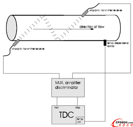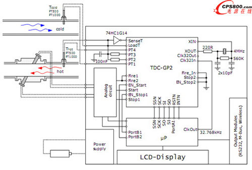TDC-GP2 很適合低成本的超聲波熱量計設(shè)計。由于其良好的功能性(包括精確的溫度測量,觸發(fā)脈沖產(chǎn)生器校準(zhǔn)器),加上一個簡單的微處理器(不需要 A/D 轉(zhuǎn)換)和一個傳感驅(qū)動與接收器,就可以構(gòu)成一個完整的超聲波熱量計。如圖4的示意圖和圖5典型電路圖: