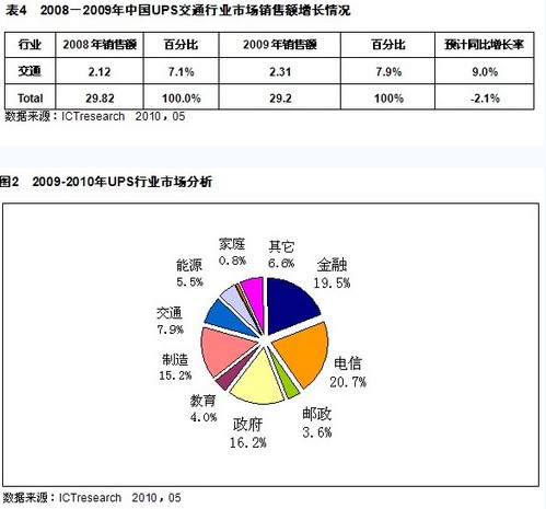 根據(jù)ICTResearch的研究顯示,2009年UPS在交通行業(yè)的銷售額同比增長(zhǎng)達(dá)到了9.0%,而整體UPS行業(yè)的增長(zhǎng)率則出現(xiàn)了小幅下滑,交通行業(yè)在UPS市場(chǎng)中的占比同比也提高了0.9%,預(yù)計(jì)在2010年,隨著交通行業(yè)的投資的高速增長(zhǎng),交通行業(yè)的占比還將進(jìn)一步的提高!
