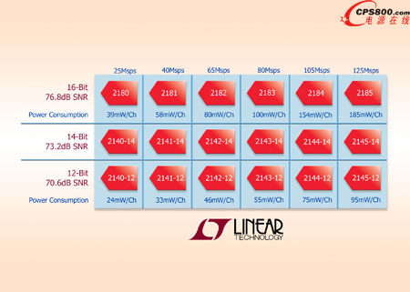 不同速率版本是引腳兼容的,速率包括 25Msps (每通道 24mW)、40Msps (每通道33mW)、65Msps (每通道46mW)、80Msps (每通道 55mW)、105Msps (每通道 75mW) 和 125Msps (每通道 95mW)。將器件置于備用 (16mW) 或停機 (1mW) 模式,還可以進一步節省功率。750MHz 的模擬全功率帶寬和 0.08psRMS 的超低抖動允許以卓越的噪聲性能對 IF 頻率進行欠采樣。這些器件采用了凌力爾特公司的數字輸出隨機函數發生器和交替位極性 (ABP) 模式特征,旨在減少數字反饋。