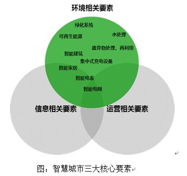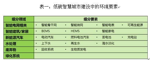 低碳智慧城市建設中的環境要素,其內涵主要指應用先進信息技術,對城市能源以及其他資源的供應設施和消費終端進行智能化管理,以達到可再生能源的可利用和資源消費的高效化。環境要素的細分領域,可包含智能電網、智能建筑/家居、新能源汽車、水處理、廢棄物處理及綠化系統等。