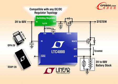 4月19日,凌力爾特公司推出一款高電壓控制器和電源管理器 LTC4000,它實際上可將任何外部補償的DC/DC電源轉換為一個全功能的電池充電器。LTC4000 能夠驅動常用的 DC/DC 轉換器拓撲結構,包括降壓、升壓、降壓-升壓、SEPIC 和反激式。該器件提供了精準的輸入和充電電流調節,并可在一個 3V 至 60V 的寬輸入和輸出電壓范圍內運作,因而與多種不同的輸入電壓電源、電池組和電池化學組成相兼容。其典型應用包括高功率電池充電器系統、高性能便攜式儀器、電池后備系統、配備電池的工業設備、以及筆記本電腦 / 小型筆記本電腦。