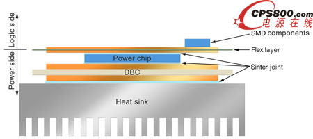 一種新的方法是在芯片的上側和與散熱器的熱連接中同樣使用銀燒結技術。這里,芯片上表面采用燒結工藝與一塊柔性且結構化的板相連接。線路結構如此厚以致于它們都能夠承載負載電流。DBC的底面直接燒結到散熱器上(見圖3)。主要的電氣端子也可被燒結到DBC上,取代現有的焊接或綁定線連接。銀燒結層來取代導熱硅脂,由此產生的低熱阻意味著功率密度可增大30%。帶有均勻芯片接觸的柔性板替代綁定線提高了可靠性。芯片接觸區與柔性板之間熱膨脹系數兼容性的改善是負載循環能力增強的原因。這使得開發不使用綁定線、焊接和導熱硅脂的封裝技術成為可能。