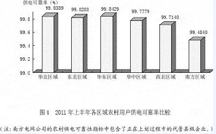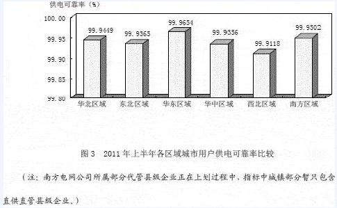 2011年上半年,全國供電系統城市用戶供電可靠率(RS1)為99.9222%,同比提高0.0002個百分點,用戶半年平均停電時間為3小時24分鐘,同比降低0.6分鐘。平均停電時間中故障平均停電時間為44分鐘,預安排平均停電時間為2小時40分鐘。