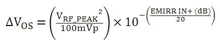 方程式 1 中,VRF_PEAK 為所用 RF 電壓的峰值,VOS 為放大器的 DC 偏移電壓,而 100 mVP 為 100 mVP 輸入信號 EMIRR IN+ 參考。