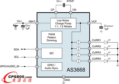 AS3668引人注目的燈光效果作為額外的用戶界面,可改善移動設備的外觀并帶來更高附加值。其12-bit PWM調光功能可實現諸如在高低不同亮度中無縫過渡的平滑呼吸燈效果。芯片同時擁有音頻同步模式,可根據音頻內容使LED改變亮度和顏色。