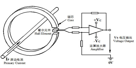 霍爾電流傳感器開環(直放式)原理:如圖1所示,當原邊電流IP流過一根長導線時,在導線周圍將產生磁場,磁場的大小與流過導線的電流成正比,產生的磁場聚集在磁環內,通過磁環氣隙中霍爾元件進行測量并放大輸出,其輸出電壓VS精確的反映原邊電流IP。一般的額定輸出標定為4V/5V。