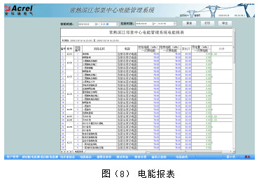用電量報表功能,可選擇時間段進行查詢,支持任意時間段電度累計查詢,具備數據導出和報表打印等功能。為值班人員提供了精確可靠的電能報表。該報表各回路名稱和數據庫關聯,方便用戶修改回路名稱。如下圖所示,顯示某段時間內的各配電回路的精確用電量,用戶可以直接打印報表,可以以EXCEL格式另存到其他位置。 見圖(8)。
