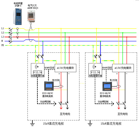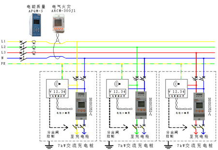 交流充電樁一般功率在7kW左右,總進(jìn)線回路配置電能質(zhì)量分析儀,對(duì)整個(gè)充電樁供電回路電能質(zhì)量進(jìn)行監(jiān)測(cè)。進(jìn)線回路同時(shí)設(shè)置電氣火災(zāi)監(jiān)控裝置,充電管理控制器,負(fù)責(zé)充電計(jì)費(fèi)控制;單相導(dǎo)軌式交流電能表,用于充電電能計(jì)量,電能數(shù)據(jù)由充電管理控制器通過(guò)RS485通訊口讀。贿M(jìn)線側(cè)配置帶漏電保護(hù)斷路器;充電側(cè)配置帶電操微型斷路器等。
