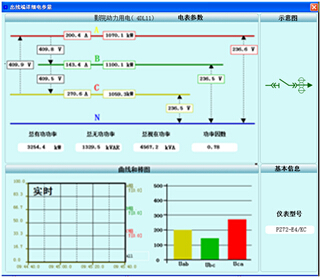 電壓、電流、功率、功率因數(shù)及頻率等監(jiān)測信息實(shí)時(shí)刷新,并以一次圖形式直觀動(dòng)態(tài)顯示。各回路子畫面上顯示該回路各電參量、回路名稱、電流越限值等信息。