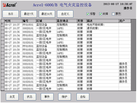 Acrel-6000電氣火災(zāi)監(jiān)控系統(tǒng)是本公司自主研發(fā)的用于接收剩余電流式電氣火災(zāi)探測(cè)器等現(xiàn)場(chǎng)設(shè)備信號(hào),以實(shí)現(xiàn)對(duì)被保護(hù)電氣線(xiàn)路的報(bào)警、監(jiān)視、控制、管理的運(yùn)行于計(jì)算機(jī)的工業(yè)級(jí)硬件/軟件系統(tǒng)。本系統(tǒng)應(yīng)用于大型商場(chǎng)、生活小區(qū)、生產(chǎn)基礎(chǔ)、辦公大樓、商場(chǎng)酒店等區(qū)域的消防控制中心,對(duì)分散在建筑內(nèi)的探測(cè)器進(jìn)行遙測(cè)、遙調(diào)、遙控、遙信,方便實(shí)現(xiàn)監(jiān)控與管理。本系統(tǒng)采用標(biāo)準(zhǔn)的Modbus現(xiàn)場(chǎng)總線(xiàn)將具有通信功能的探測(cè)器相互連接起來(lái),當(dāng)現(xiàn)場(chǎng)保護(hù)線(xiàn)路中的被探測(cè)參數(shù)超過(guò)報(bào)警設(shè)定值時(shí),能發(fā)出報(bào)警信號(hào)、控制信號(hào),能指示報(bào)警部位并保存報(bào)警信息。