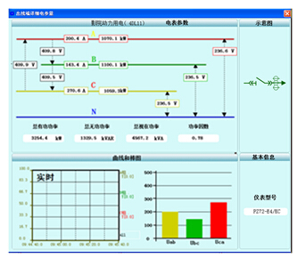 電壓、電流、功率、功率因數及頻率等監測信息實時刷新,并以一次圖形式直觀動態顯示。各回路子畫面上顯示該回路各電參量、回路名稱、電流越限值等信息。