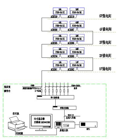 管理系統(tǒng)主要實現(xiàn)羅店鎮(zhèn)市民服務中心樓層配電箱實時用電監(jiān)測與電能管理。監(jiān)控范圍為8層樓內的10只多功能儀表。現(xiàn)場多功能儀表通過一條總線接入值班室采集器,再將通過采集器連接到監(jiān)控主機,從而在監(jiān)控主機上實現(xiàn)總線上儀表與監(jiān)控主機的數(shù)據(jù)連通。如下圖所示:站控管理層、網(wǎng)絡通訊層和現(xiàn)場設備層。