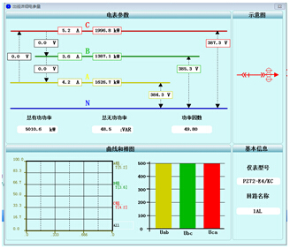 電壓、電流、功率、功率因數(shù)及頻率等監(jiān)測信息實時刷新,并以一次圖形式直觀動態(tài)顯示。各回路子畫面上顯示該回路各電參量、回路名稱、電流越限值等信息。