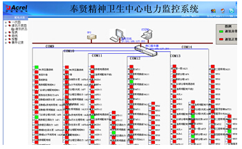 本次項目主要涉及賢精神衛生中心中配電室及三棟樓內的網絡多功能儀表,配電室內共有2臺變壓器,32個出線回路以及樓層配電箱內95只多功能儀表。監控主機位于病房樓一層的消防控制室。