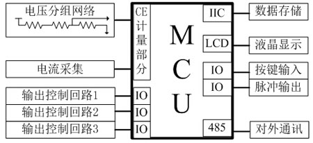 宿舍安全用電智能管理終端采用專用功能的微控制單元(Micro Control Unit,MCU)設(shè)計。整機的硬件系統(tǒng)實現(xiàn)依據(jù)各個功能模塊而展開,包含微處理器、電阻分壓網(wǎng)絡(luò)電壓采樣、電流互感器電流采樣、三路磁保持繼電器控制輸出、鐵電數(shù)據(jù)存儲、液晶顯示、按鍵輸入、有功電能脈沖指示輸出等。硬件組成如圖1所示。
