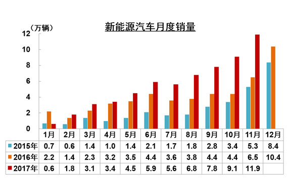 數據顯示,今年前11個月新能源車型的產銷規模均取得較高水平,11月單月的產銷均超過10萬輛,其中銷量達到11.9萬輛,新能源乘用車的月度銷量為8.3萬輛。1-11月的產銷均超過60萬輛,接近年初制定的80萬輛的目標,中國汽車工業協會秘書長助理許海東說:“明年有望超過100萬輛。”