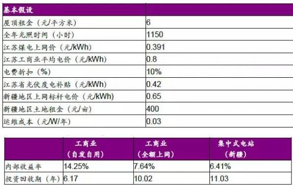 我們按照分布式電站6.5元/W系統成本、集中式電站成本7元/W系統成本,分別測算一個位于江蘇5MW裝機的工商業分布式電站與一個位于新疆50MW裝機的集中式電站收益率。對于工商業分布式電站,我們分別考慮“自發自用、余電上網”模式以及“全額上網模式”,測算結果顯示工商業分布式電站收益率高于集中式電站收益率水平。