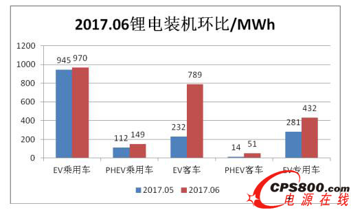 統計數據顯示,2017年6月中國電動汽車市場鋰離子電池裝機總量為2.39GWh,環比增長高達51.03%(上個月1.58GWh)。其中,純電動乘用車6月份電池裝機970MWh,環比增長2.64%,是增幅最小的;最大的貢獻來自純電動客車和插混客車市場,二者的電池裝機量分別是789MWh和432MWh,環比增長分別高達272%和240%。總體上,電動客車產量的回暖推動了6月份鋰電裝機量的高速增長。